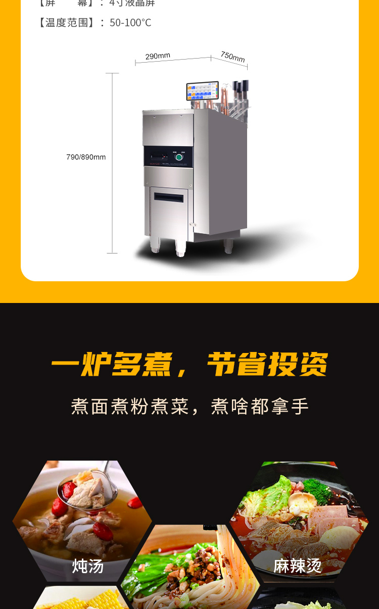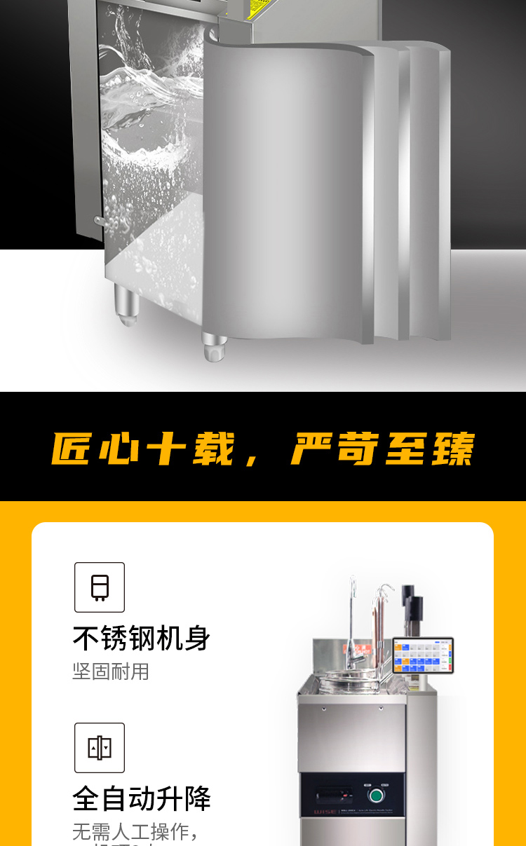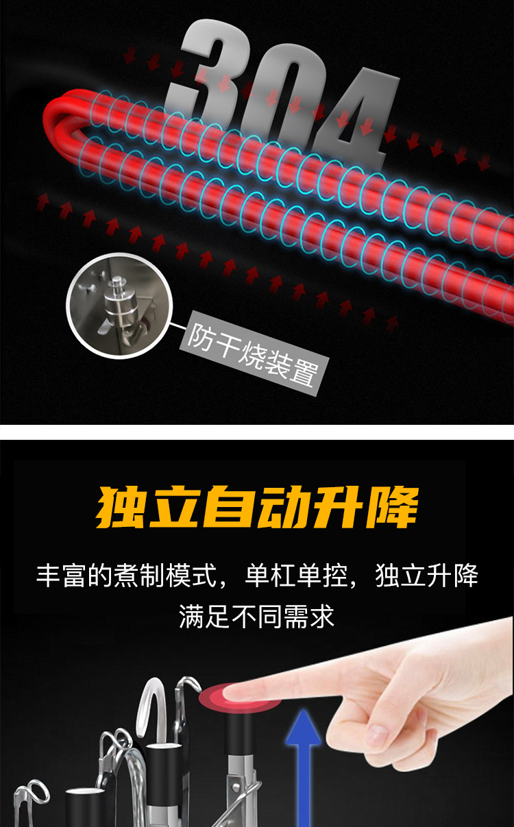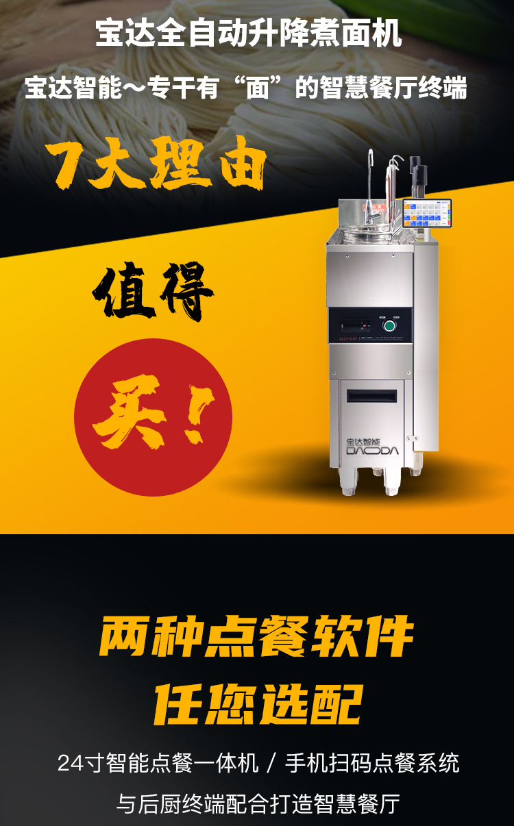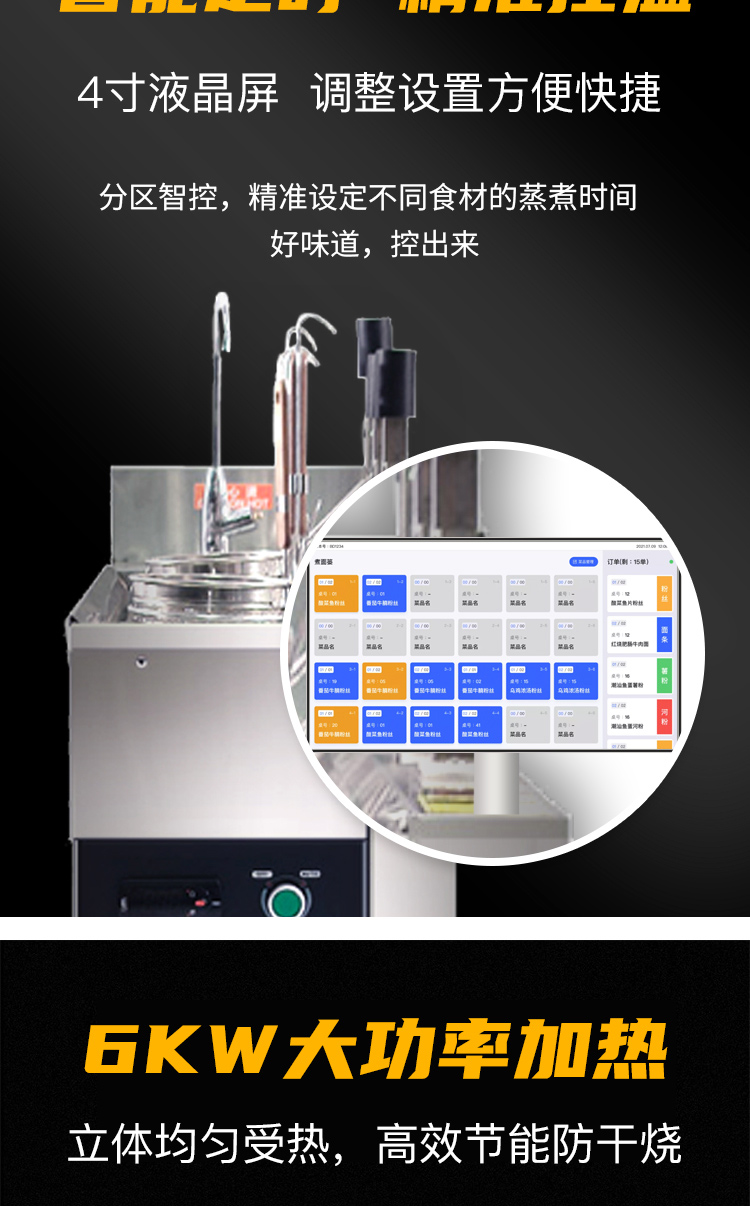 訂購標配:智能溫控系統、獨立控制自動升降桿、高峰期和非高峰期煮制模式、低水位斷電保護、大功率噴流罩、精制面簍