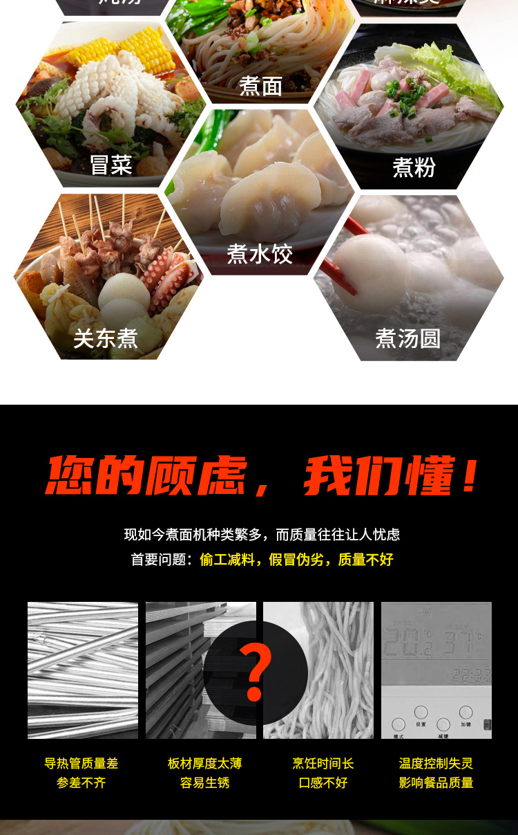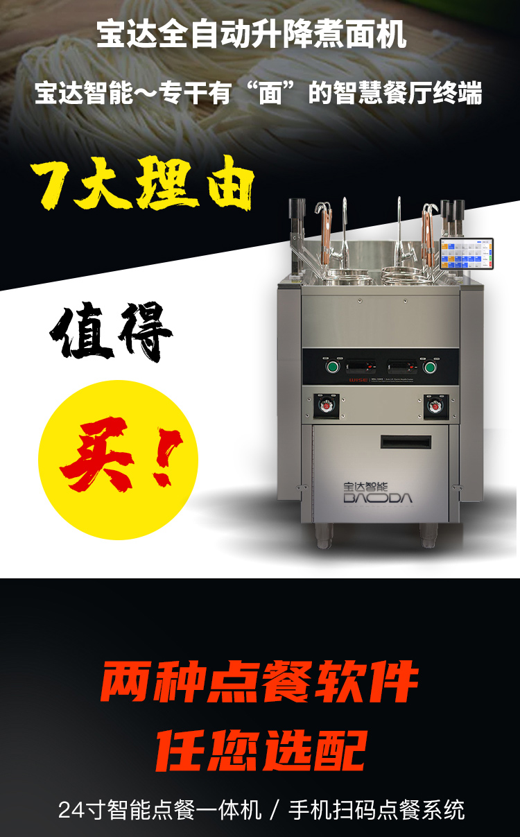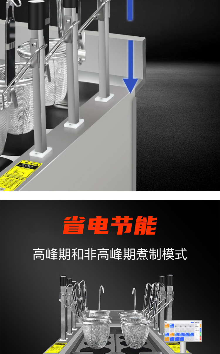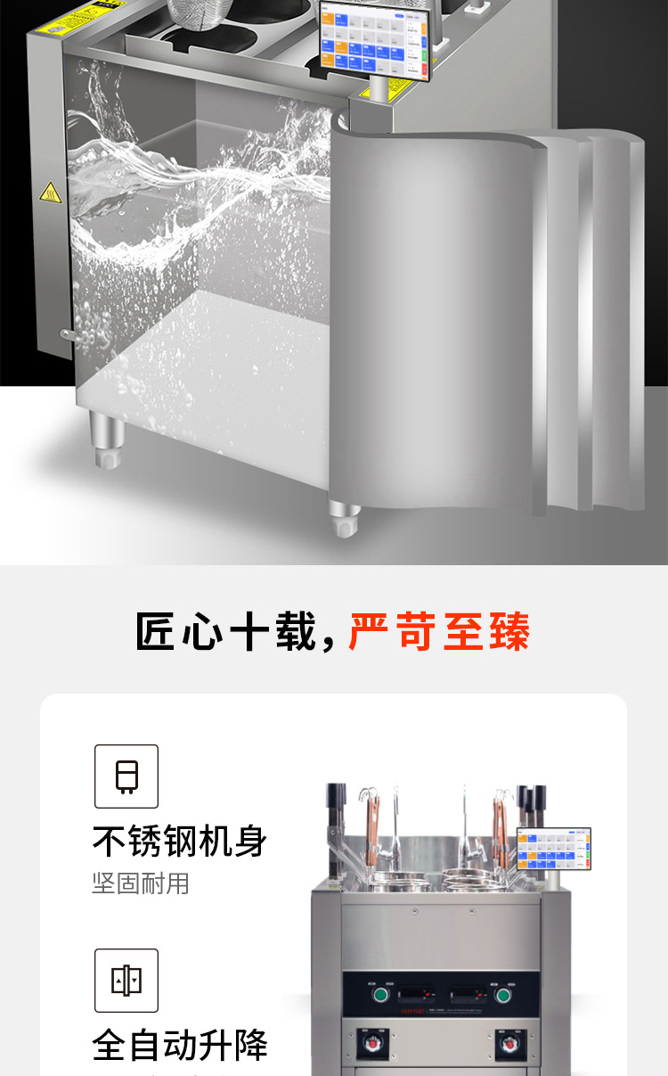 訂購標配:智能溫控系統、獨立控制自動升降桿、高峰期和非高峰期煮制模式、低水位斷電保護、大功率噴流罩、精制面簍