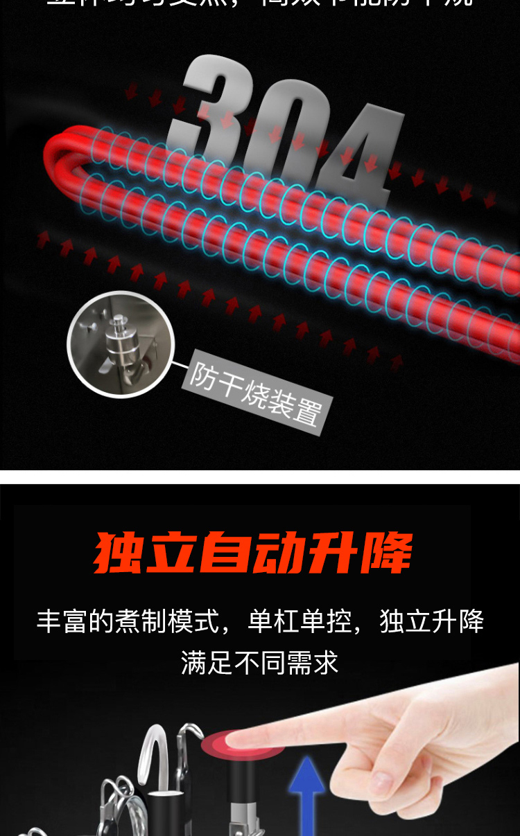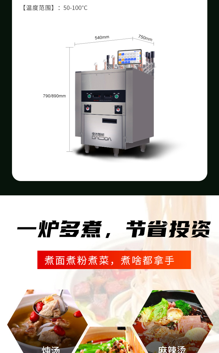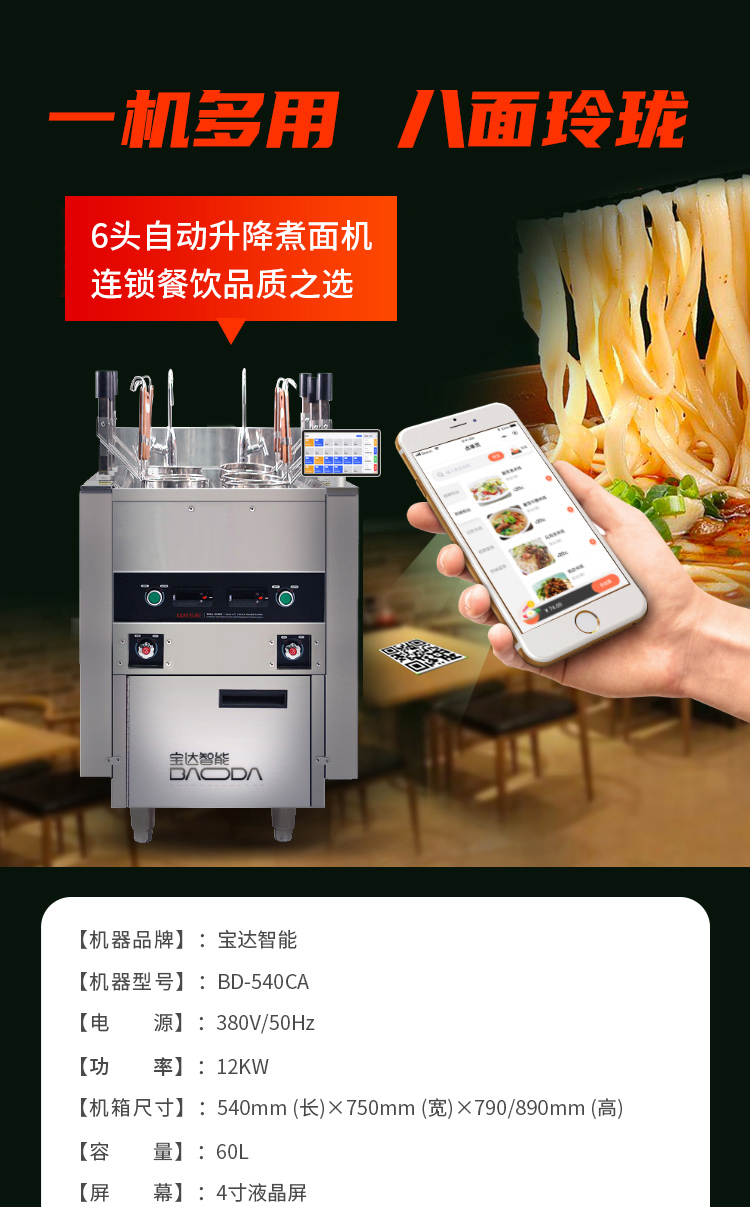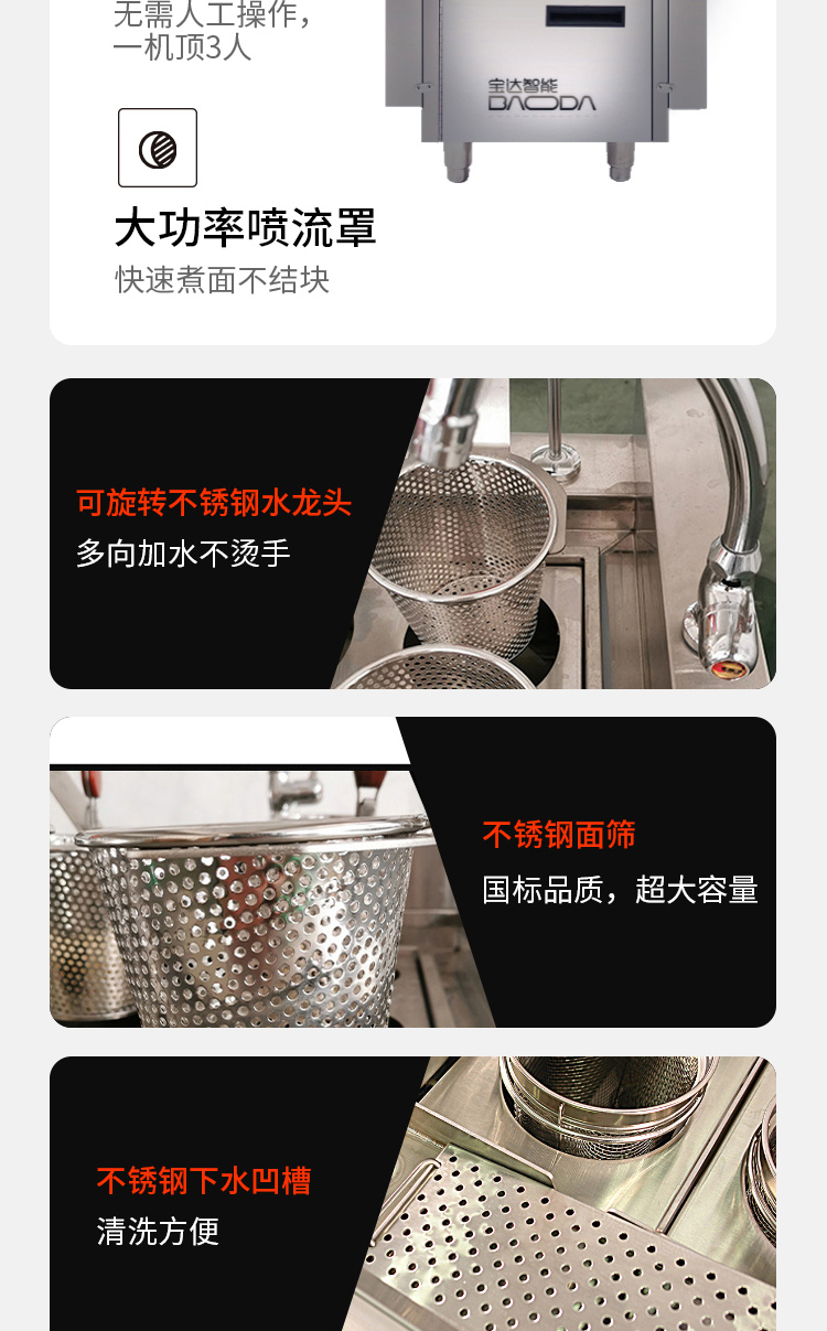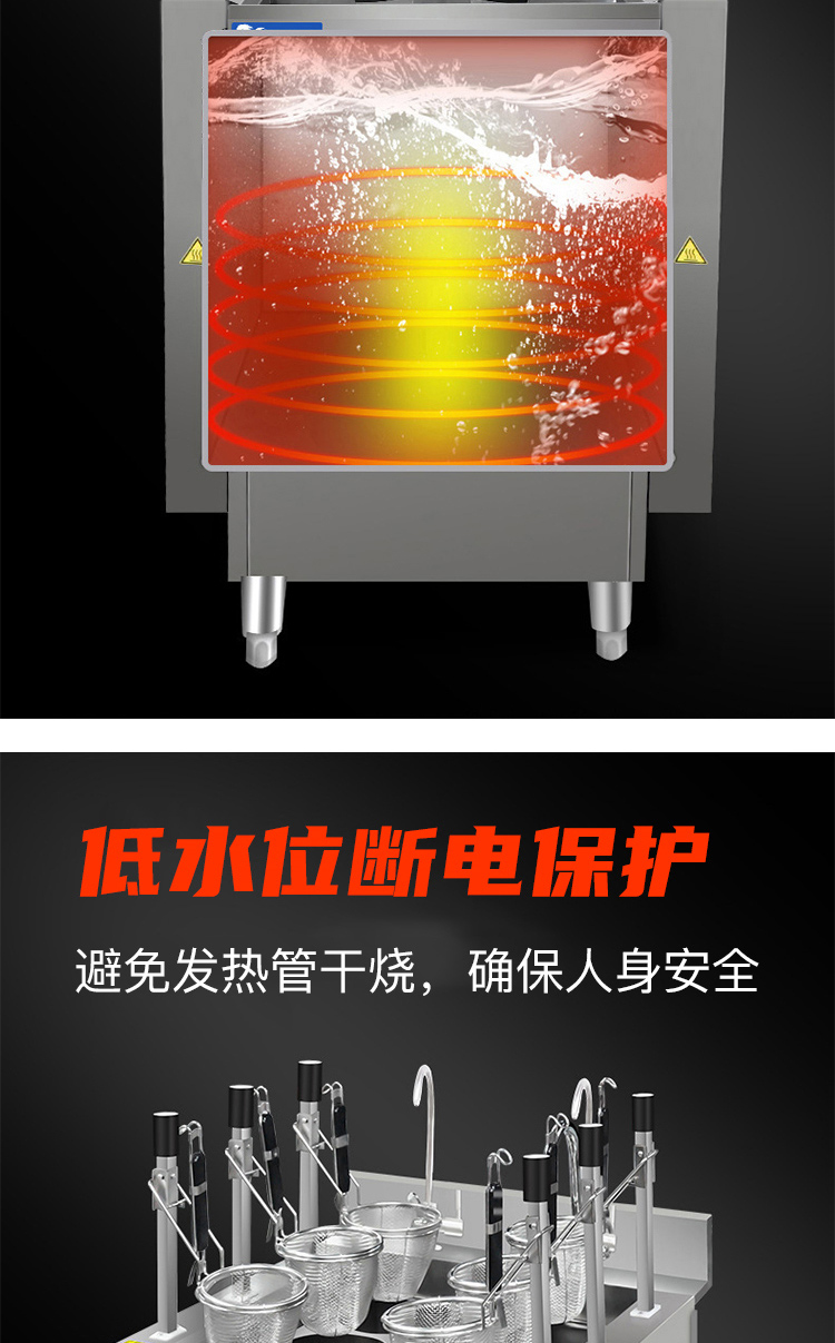 訂購標配:智能溫控系統、獨立控制自動升降桿、高峰期和非高峰期煮制模式、低水位斷電保護、大功率噴流罩、精制面簍