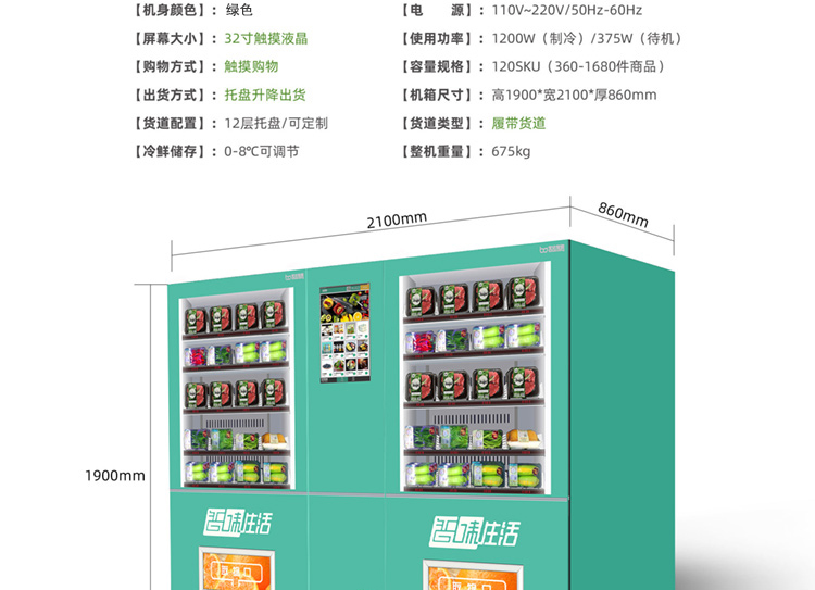 訂購標配:(0-8°c)制冷機組+數碼電子標簽+智能防盜門+智能電動取貨門+22寸液晶屏+觸摸屏+TEI45主機+微信及支付寶支付